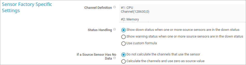 Show down status when one or more source sensors are in the down status: If at least one source sensor that you use in a channel definition is in the Down status, the Sensor Factory sensor shows the Down status as well until all referred sensors leave this status. While the Sensor Factory sensor is in the Down status, it still shows data of all available channels. If a lookup definition or an error limit triggers the Down status of the source sensor, the Sensor Factory does not show the Down status. This is because the Sensor Factory should only show this status if it cannot calculate values.
